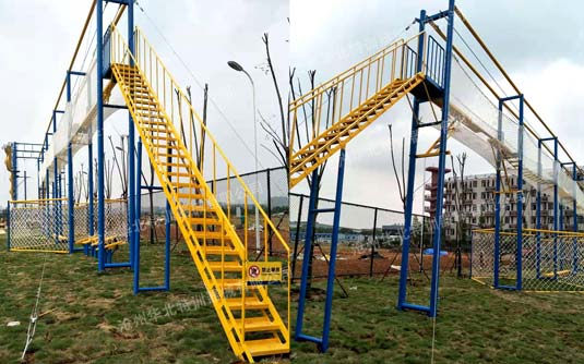 包含項(xiàng)目:獨(dú)木橋、翹板橋、橫渡天梯、吊索橋、斷橋、攜手并進(jìn)、相互依存、禮讓通行、網(wǎng)墻(2組)十個(gè)項(xiàng)目。兩側(cè)有斜樓梯上下。